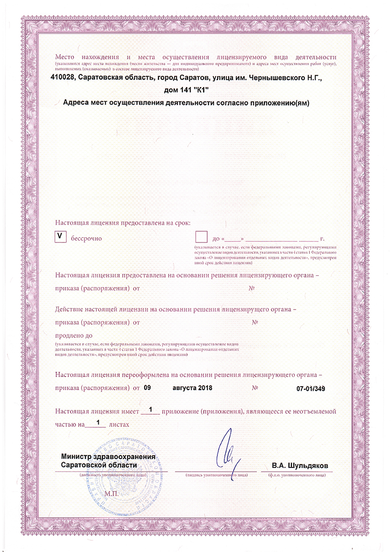 № ЛО-64-01-004179 от 09 августа 2018 г. на осуществление медицинской деятельности. Выдана Министерством здравоохранения Саратовской области.